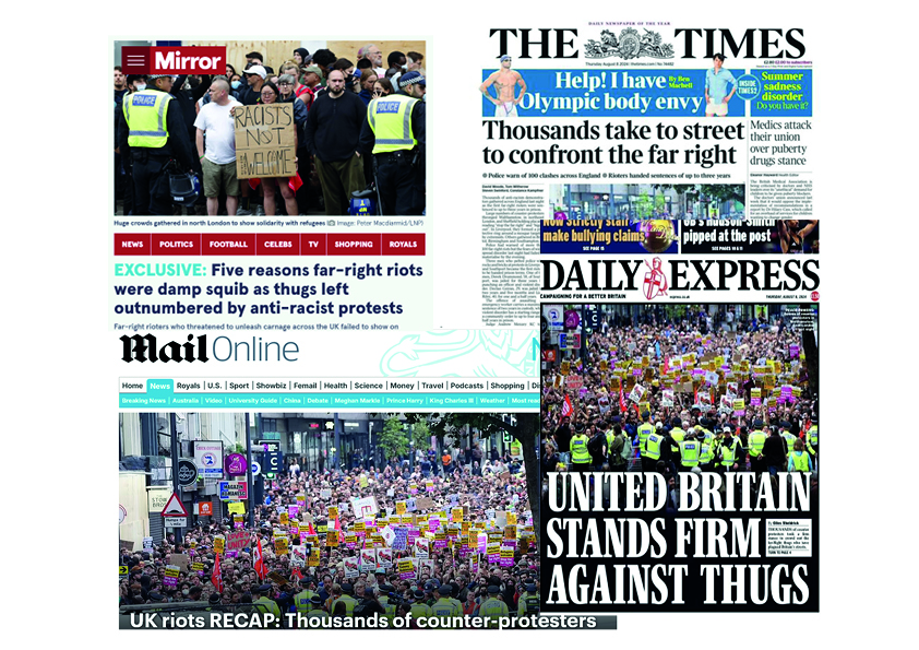 Ytterhögerns våldsamma mobiliseringar i Storbritannien har slagits tillbaka av omfattande folkliga mobiliseringar. Kanske det tydligaste tecknet på vilket genomslag motdemonstrationerna fått är den normalt högervridna brittiska pressen.